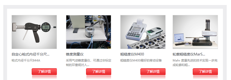 產(chǎn)品中心界面有清晰的產(chǎn)品類(lèi)目:通用量具,在線(xiàn)測量,精密設備,計量設備,理化試驗等,每款產(chǎn)品