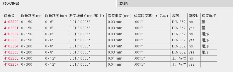 | 訂單號 | 測量范圍 mm | 測量范圍 inch | 數字增量(mm/英寸) | 誤差限度 (mm) | 誤差限度英寸(文本) | 規范 | 摩擦輪 | 深度測桿 |